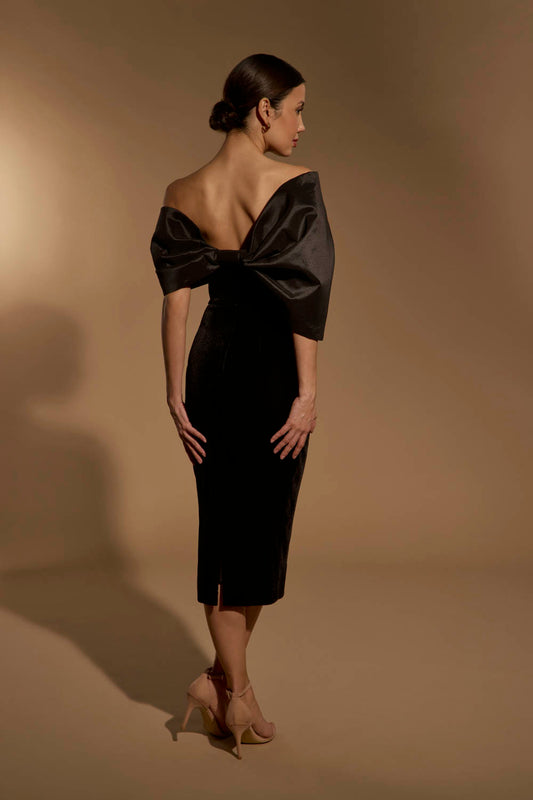 Iris Off Shoulder Velvet Midi Dress with Sculpted Sleeve Detail