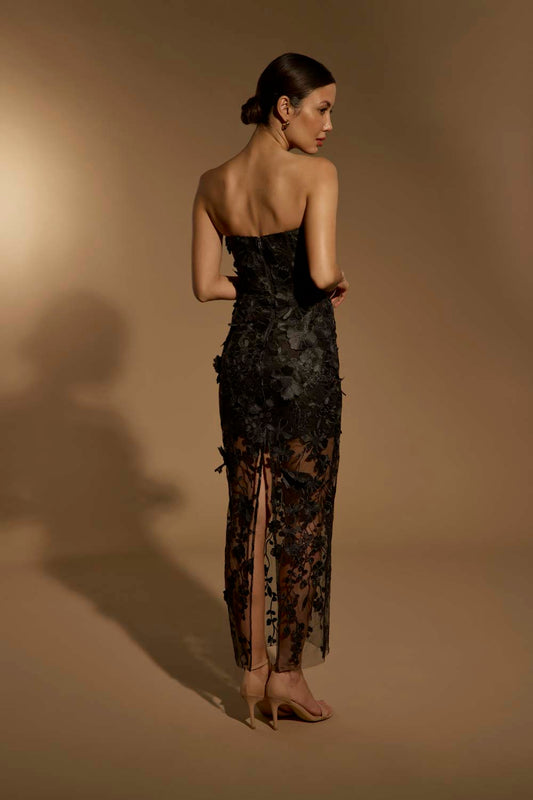 Sweeping maxi hemlines mix with spotlight-stealing bodycon silhouettes across a collection of luxe fabrics and intricate embellishment.