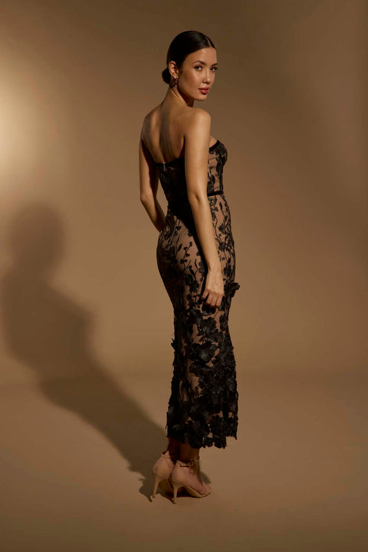 Kate Strapless Satin Midi Dress with Bust Overlay